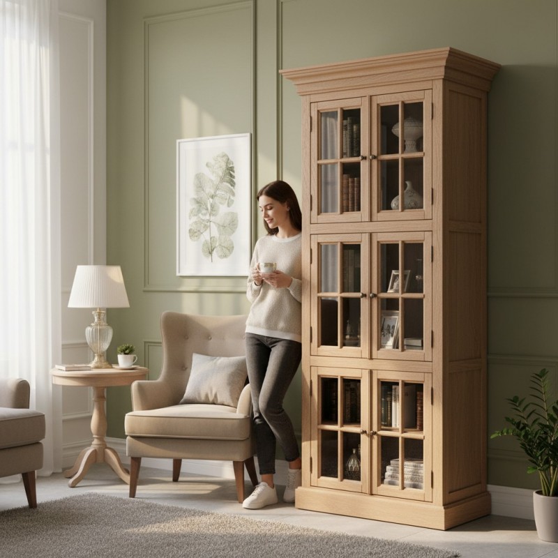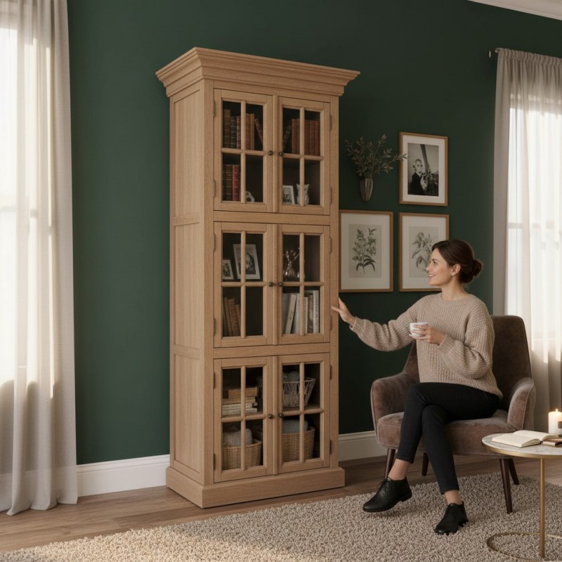 Structura solidă din lemn masiv garantează durabilitate în timp, iar finisajele atent realizate evidențiază textura naturală a lemnului. Ușile vitrate, împărțite în compartimente simetrice, oferă un aspect clasic și permit expunerea discretă a obiectelor din interior, protejându-le totodată de praf.